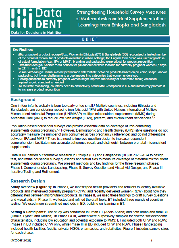 DataDENT carried out formative research in Ethiopia (ET) and Bangladesh (BD) in 2023-2024 to design, test, and refine household survey questions and visual aids to measure coverage of maternal micronutrient supplements during pregnancy. We present methods and key findings for the three research phases: Phase I. Comprehensive Landscaping, Phase II. Survey Question and Visual Aid Design; and Phase III. Iterative Testing and Refinement.