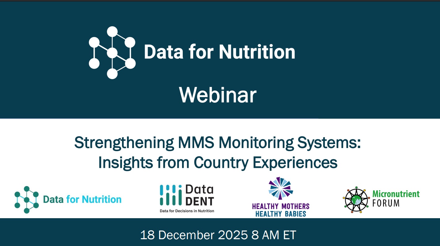 Description: In this webinar, participants heard about country and global perspectives on integrating Multiple Micronutrient Supplementation (MMS) indicators into national health information systems. Participants gained actionable insights from real-world experiences, understand emerging priorities in MMS monitoring, and learn strategies for strengthening measurement systems to support program scale-up and impact.